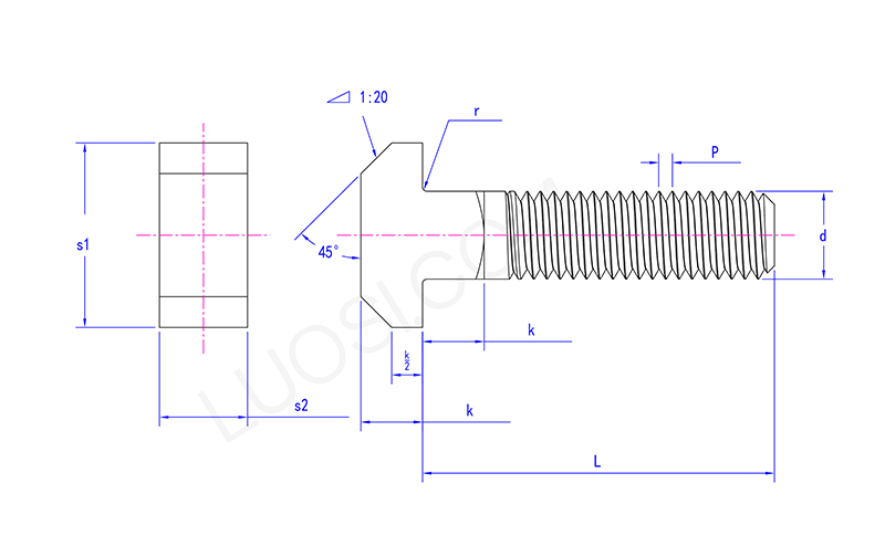 رأس براغي الرقبة المربعة هو شكل "T" أفقيًا ، تمامًا مثل الحرف "T". يمكّن هذا الرأس الواسع على شكل حرف T أن يكون الترباس عالقًا في الأخدود على شكل حرف T ، حيث يلعب دورًا في منع السحب من الترباس.